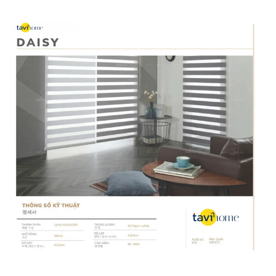 Rèm cầu vồng TAVI PD-DAISY là sản phẩm kết hợp giữa hai tính năng màn ngang & màn cuốn, được thiết kế theo kiểu hai lớp vải màn dệt đan xen giữa dải xuyên sáng và dải không xuyên sáng, vừa điều tiết ánh sáng theo kiểu màn ngang, và lợi ích không chiếm không gian, mật độ phủ kín cao của màn cuốn. Do rèm cầu vồng được thiết kế đan xen giữa dải xuyên sáng và dải không xuyên sáng, nên bạn có thể điều chỉnh sáng tối theo ý thích của bạn giữa hai lớp vải.