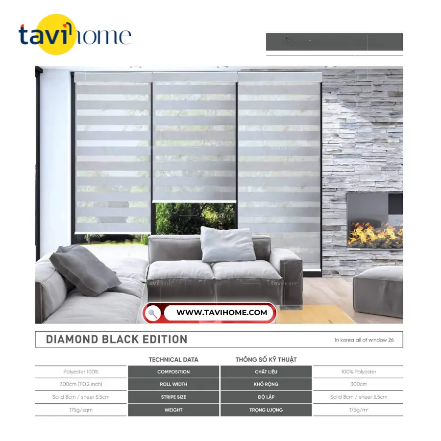 Rèm cầu vồng TAVI SK-DIAMOND là sản phẩm kết hợp giữa hai tính năng màn ngang & màn cuốn, được thiết kế theo kiểu hai lớp vải màn dệt đan xen giữa dải xuyên sáng và dải không xuyên sáng, vừa điều tiết ánh sáng theo kiểu màn ngang, và lợi ích không chiếm không gian, mật độ phủ kín cao của màn cuốn. Do rèm cầu vồng được thiết kế đan xen giữa dải xuyên sáng và dải không xuyên sáng, nên bạn có thể điều chỉnh sáng tối theo ý thích của bạn giữa hai lớp vải.