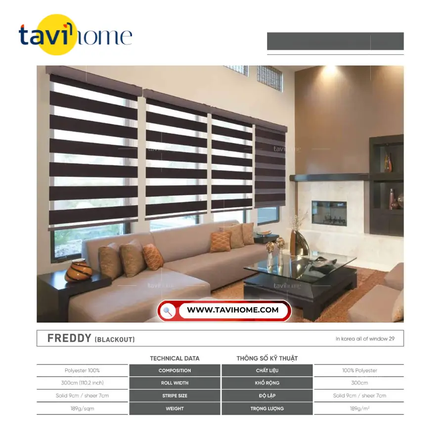 Rèm cầu vồng TAVI SK-FREDDY là sản phẩm kết hợp giữa hai tính năng màn ngang & màn cuốn, được thiết kế theo kiểu hai lớp vải màn dệt đan xen giữa dải xuyên sáng và dải không xuyên sáng, vừa điều tiết ánh sáng theo kiểu màn ngang, và lợi ích không chiếm không gian, mật độ phủ kín cao của màn cuốn. Do rèm cầu vồng được thiết kế đan xen giữa dải xuyên sáng và dải không xuyên sáng, nên bạn có thể điều chỉnh sáng tối theo ý thích của bạn giữa hai lớp vải.