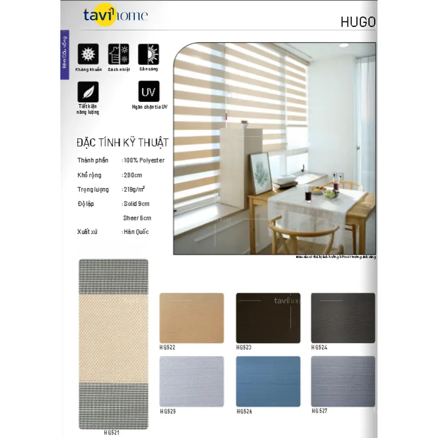 Rèm cầu vồng TAVI SK-HUGO là sản phẩm kết hợp giữa hai tính năng màn ngang & màn cuốn, được thiết kế theo kiểu hai lớp vải màn dệt đan xen giữa dải xuyên sáng và dải không xuyên sáng, vừa điều tiết ánh sáng theo kiểu màn ngang, và lợi ích không chiếm không gian, mật độ phủ kín cao của màn cuốn. Do rèm cầu vồng được thiết kế đan xen giữa dải xuyên sáng và dải không xuyên sáng, nên bạn có thể điều chỉnh sáng tối theo ý thích của bạn giữa hai lớp vải.
