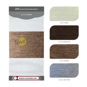 Rèm cầu vồng TAVI SK-LEO là sản phẩm kết hợp giữa hai tính năng màn ngang & màn cuốn, được thiết kế theo kiểu hai lớp vải màn dệt đan xen giữa dải xuyên sáng và dải không xuyên sáng, vừa điều tiết ánh sáng theo kiểu màn ngang, và lợi ích không chiếm không gian, mật độ phủ kín cao của màn cuốn. Do rèm cầu vồng được thiết kế đan xen giữa dải xuyên sáng và dải không xuyên sáng, nên bạn có thể điều chỉnh sáng tối theo ý thích của bạn giữa hai lớp vải.