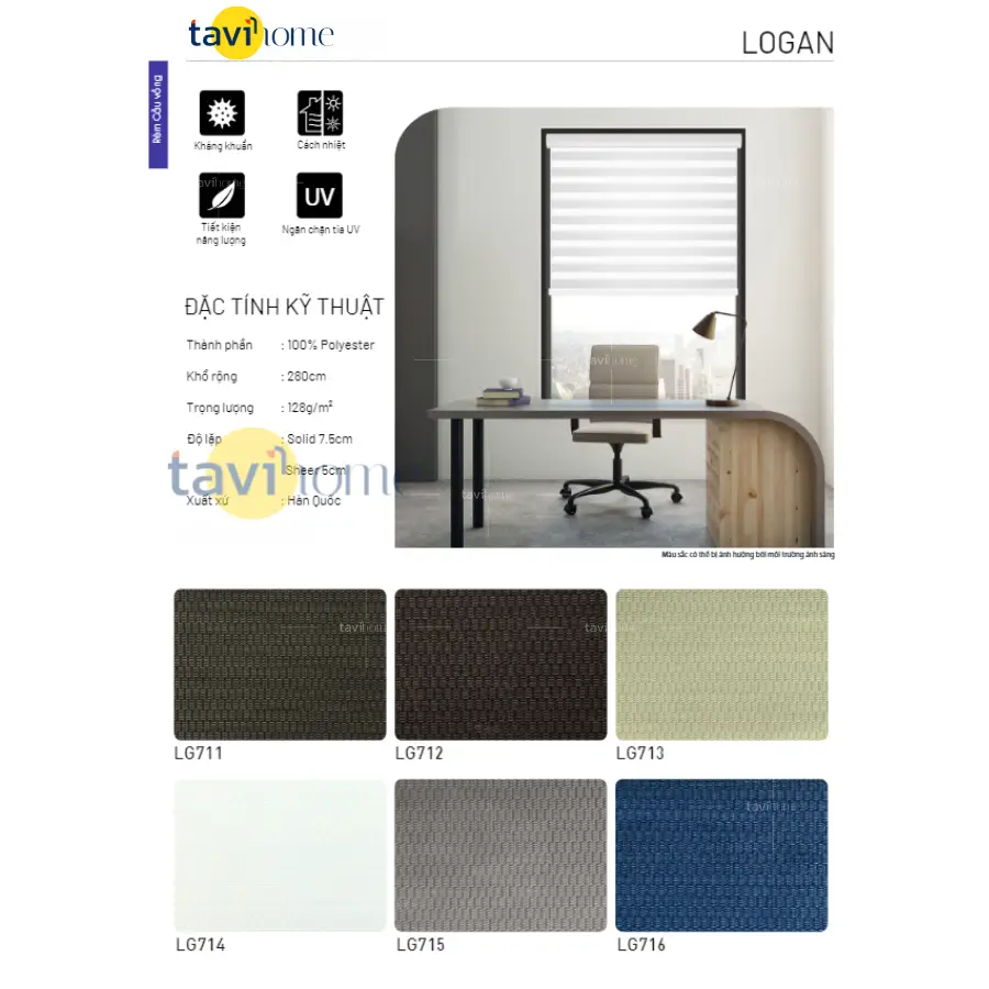 Rèm cầu vồng TAVI SK-LOGAN là sản phẩm kết hợp giữa hai tính năng màn ngang & màn cuốn, được thiết kế theo kiểu hai lớp vải màn dệt đan xen giữa dải xuyên sáng và dải không xuyên sáng, vừa điều tiết ánh sáng theo kiểu màn ngang, và lợi ích không chiếm không gian, mật độ phủ kín cao của màn cuốn. Do rèm cầu vồng được thiết kế đan xen giữa dải xuyên sáng và dải không xuyên sáng, nên bạn có thể điều chỉnh sáng tối theo ý thích của bạn giữa hai lớp vải.