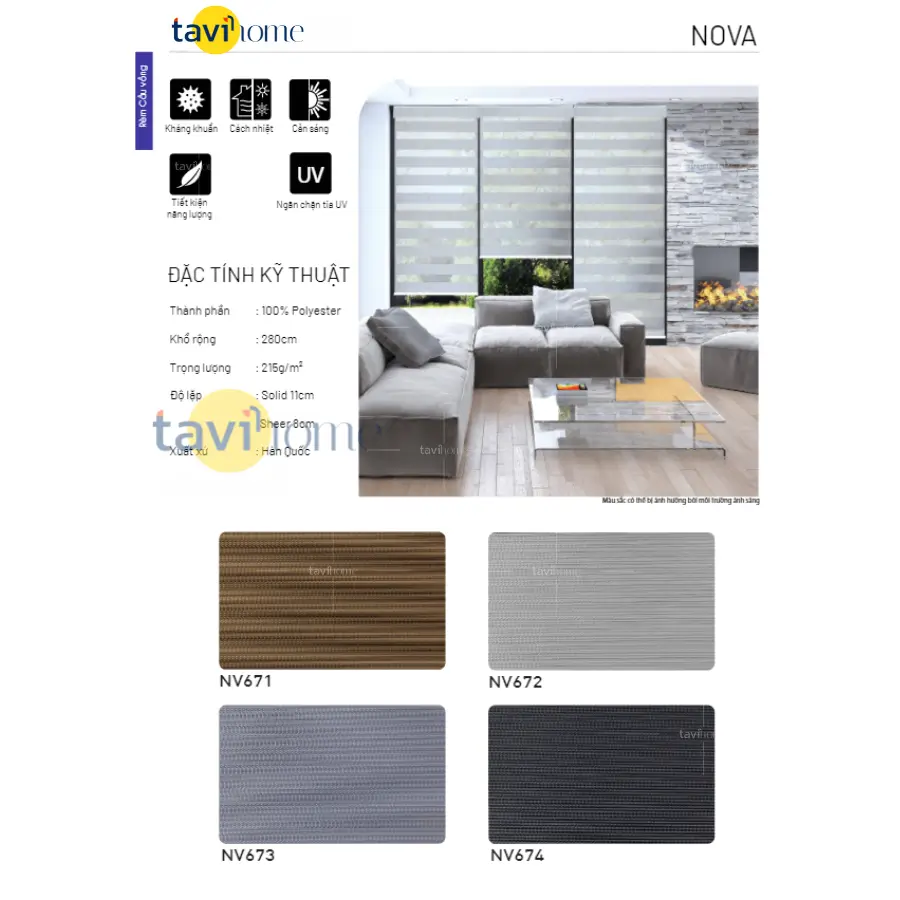 Rèm cầu vồng TAVI SK-NOVA là sản phẩm kết hợp giữa hai tính năng màn ngang & màn cuốn, được thiết kế theo kiểu hai lớp vải màn dệt đan xen giữa dải xuyên sáng và dải không xuyên sáng, vừa điều tiết ánh sáng theo kiểu màn ngang, và lợi ích không chiếm không gian, mật độ phủ kín cao của màn cuốn. Do rèm cầu vồng được thiết kế đan xen giữa dải xuyên sáng và dải không xuyên sáng, nên bạn có thể điều chỉnh sáng tối theo ý thích của bạn giữa hai lớp vải.
