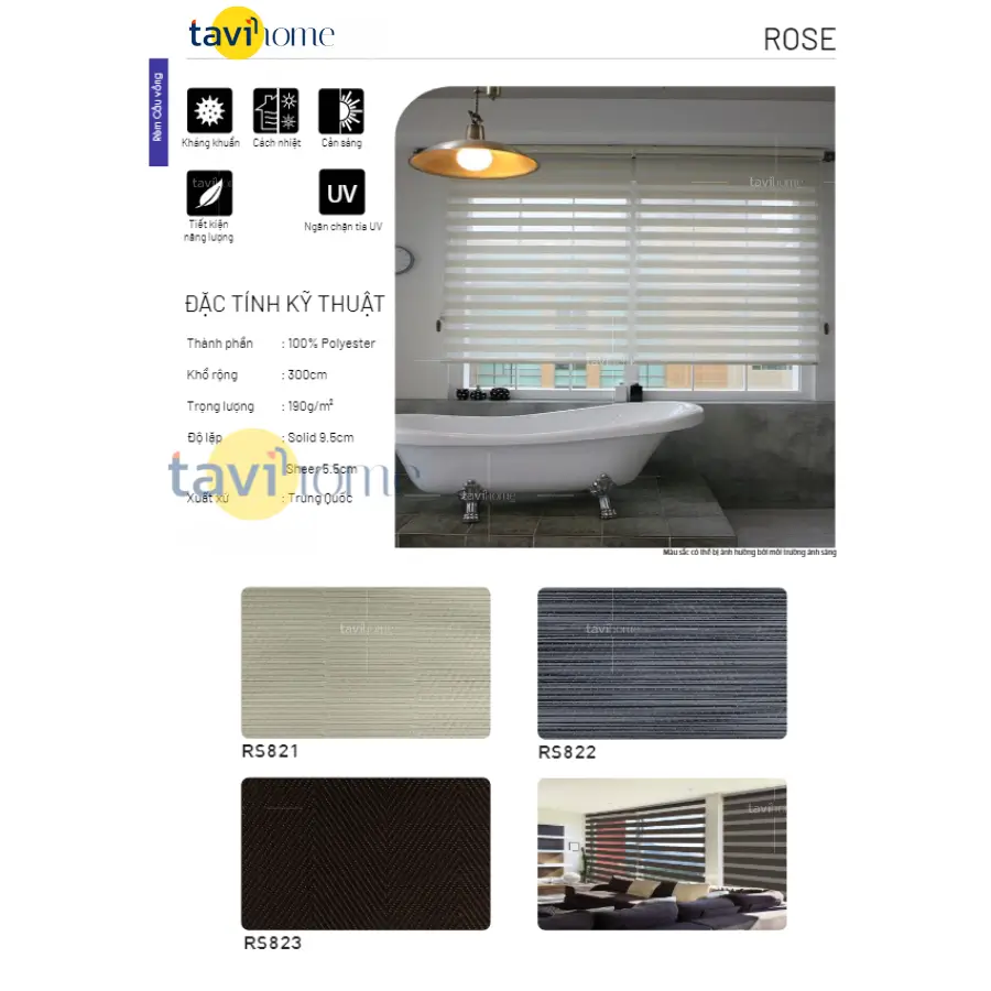 Rèm cầu vồng TAVI SK-ROSElà sản phẩm kết hợp giữa hai tính năng màn ngang & màn cuốn, được thiết kế theo kiểu hai lớp vải màn dệt đan xen giữa dải xuyên sáng và dải không xuyên sáng, vừa điều tiết ánh sáng theo kiểu màn ngang, và lợi ích không chiếm không gian, mật độ phủ kín cao của màn cuốn. Do rèm cầu vồng được thiết kế đan xen giữa dải xuyên sáng và dải không xuyên sáng, nên bạn có thể điều chỉnh sáng tối theo ý thích của bạn giữa hai lớp vải.